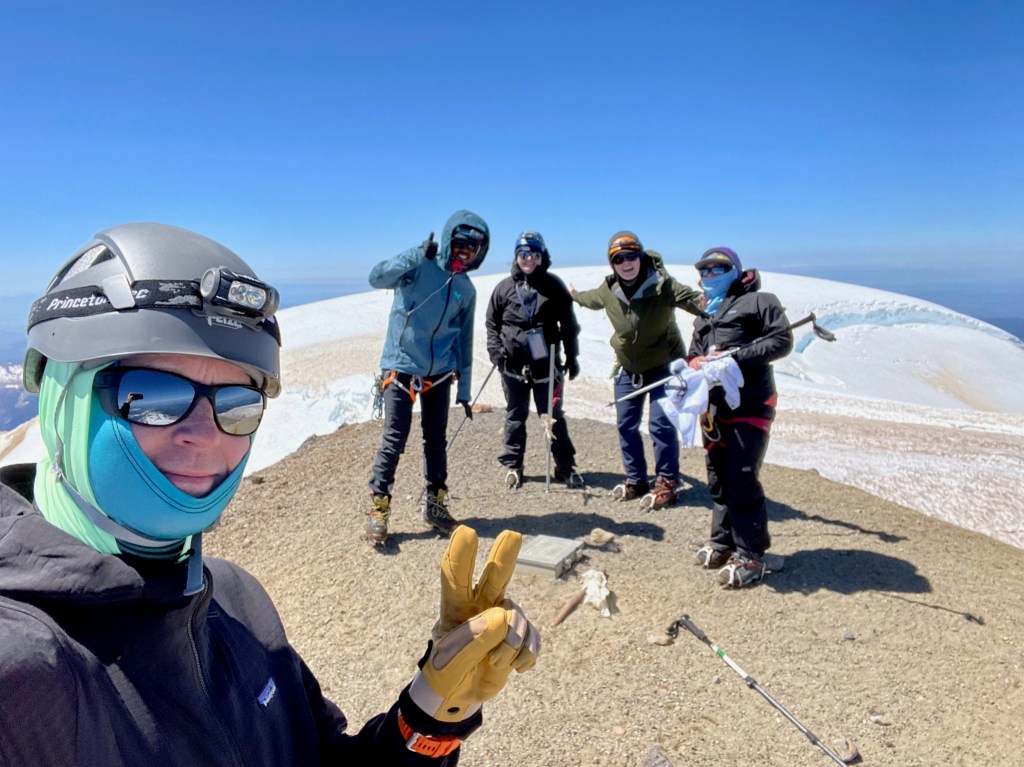 The top of the headwall was ‘messy,’ per Kush. Not wrong, and yet woefully light on details. It was like the devil’s gravel playground; every rocky step you thought would be solid was mush gravel and those you thought would be mush gravel were strangely firm as your crampons screamed, scraping over glacier-fed rivulets and streams of dirty water. All I could think was “1, get through this, 2, stay present, 3, if this is bad now what will it be like on the way down as we’re shaky in an hour or two?” Walking out of the headwall we let out a relieved ‘whoop’ to be back on our faithful pal, ole’ snow. We trekked across a pretty flat 30-minute stretch, the false summit, towards a little ‘dirt mound’ that is Grant’s Peak, the true summit of Mt. Baker.