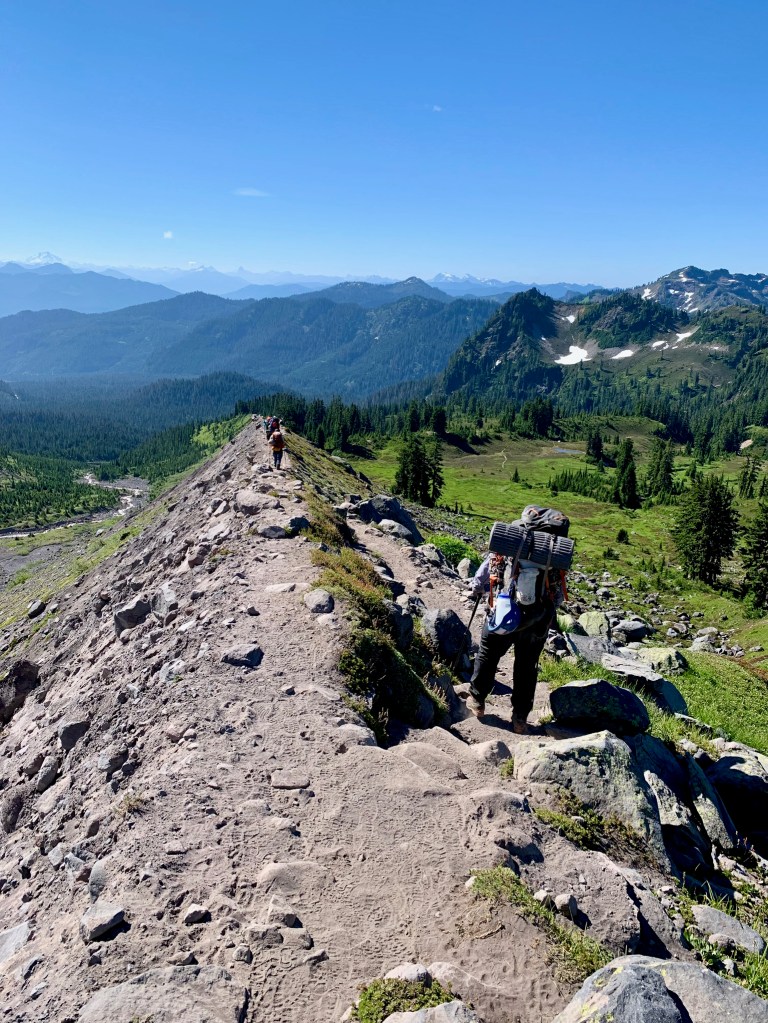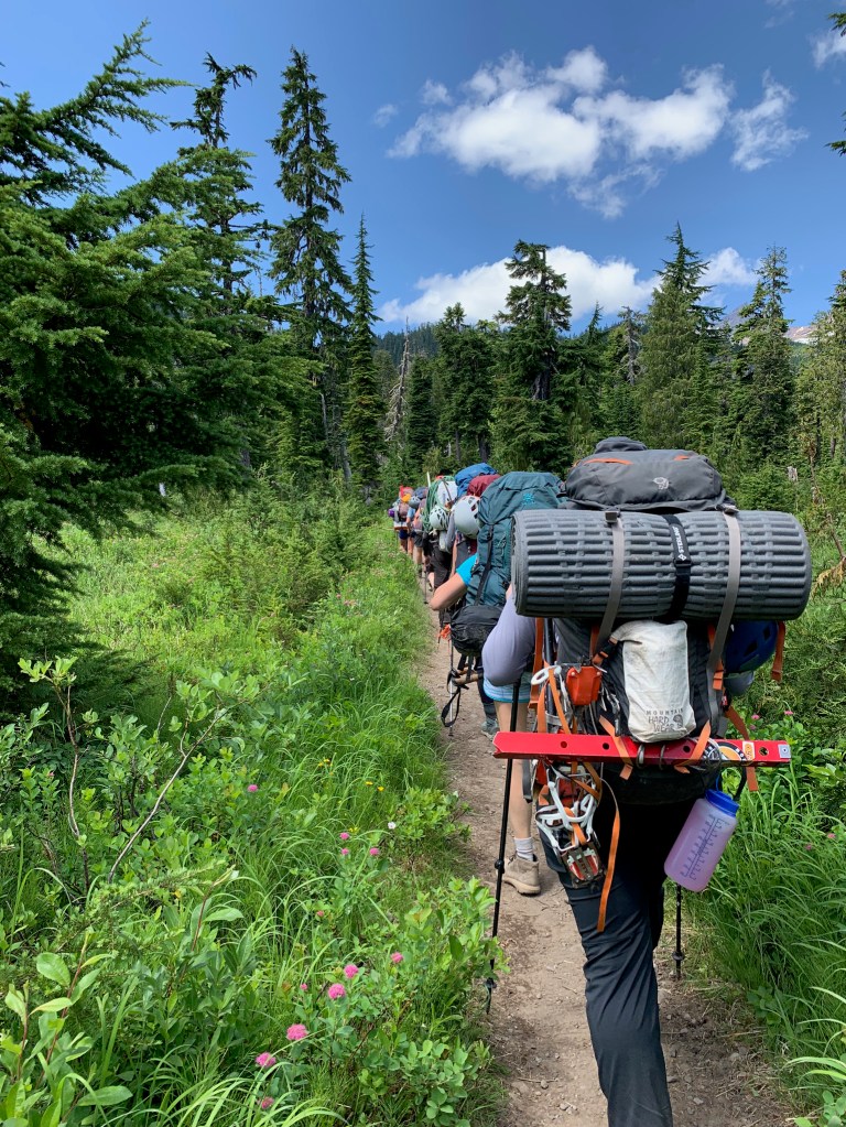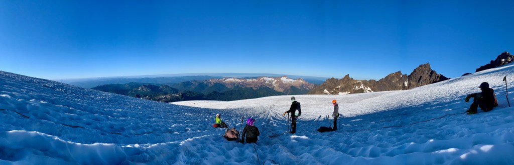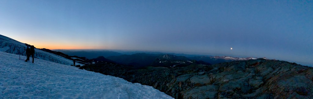 Just before 3:30am, we set off up the narrow, protruding spine beside Easton Glacier, summit-bound on Mt. Baker. It was hushed other than the crackling groans of the glacier to our right, but we were in high spirits. The only light was a constellation of headlamps before and behind me, and the massive, round moon on our left. We walked on the dusty ridge, mostly in silence except to murmur a word of caution to another hiker about a thorny spot. The group broke off into two chunks, with B and I linking up with the ‘fast guys’ group and one of our guides, Peter. We pulled ahead and began sinking our feet into snow, duck-walking the way we’d been taught the day before at ‘Snow Camp.’