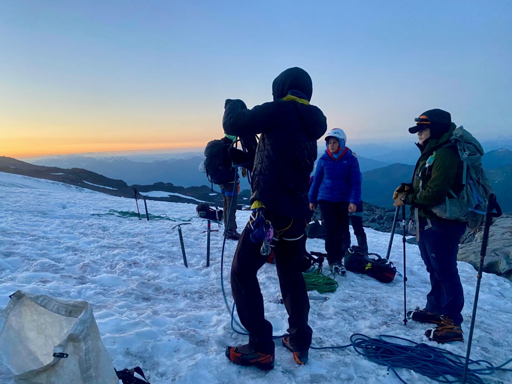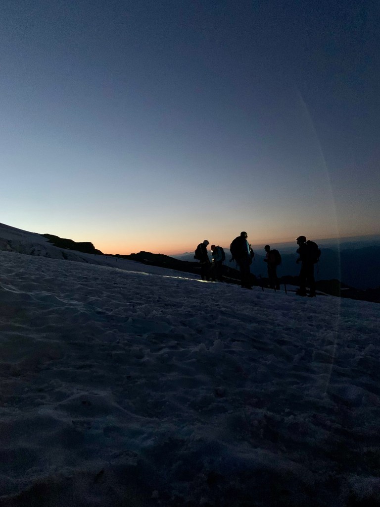 The sky softened to a salt lamp pink – the moon still holding court – but not for much longer. We reached our ‘snow from here on out’ point and sat to snack and put on our crampons, helmets, harnesses and roped up, each holding an ice axe. As the groups converged and the guides divvyed us up, we laid out our intentions for the day and pace plans.