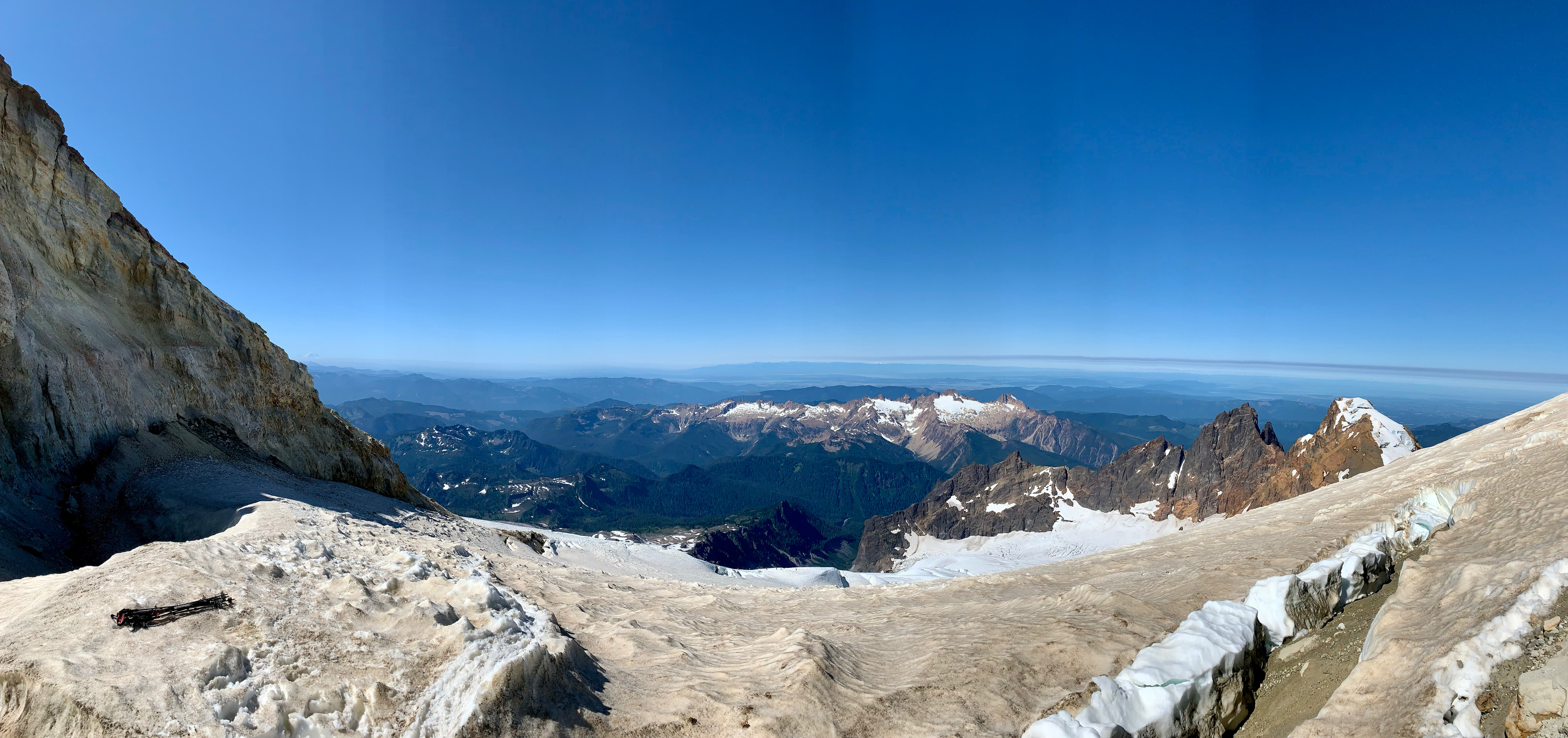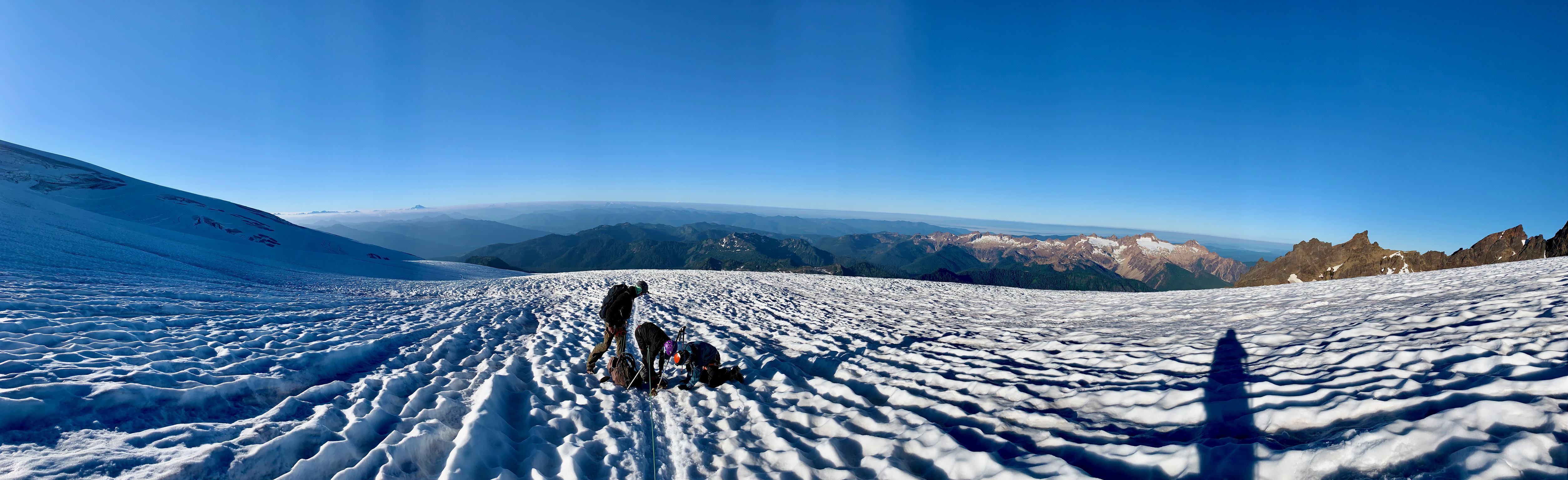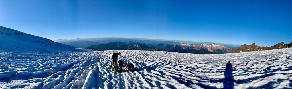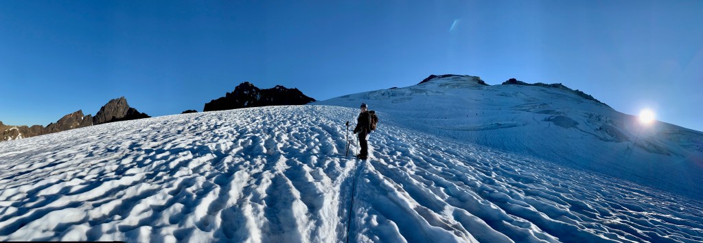 It was a single track slushy snow ledge, winding around crevasses I genuinely was too frightened to look into. I felt like the crevasse would notice me, like the Eye of Sauron, and I didn’t want their attention. Focusing my mental and physical energy to being present, aware of the rope, each step a precision placement as we inched alone, ice axe then trekking pole, ice axe then trekking pole, never stopping for more than a deep breath.