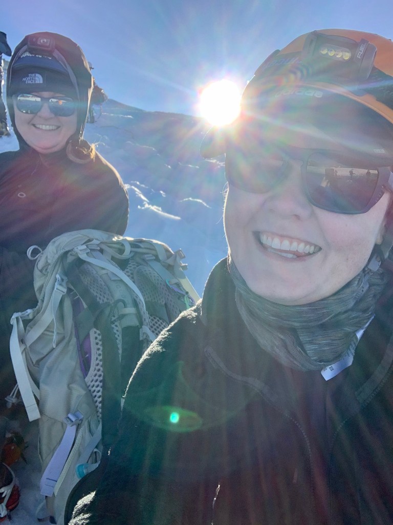 We took breaks ~every 35-50 minutes on the way up. Sinking my butt into the cold snow was such a relief, even if it was damp as I stood up. Steam was probably coming off me; I shed layers and unzipped as we walked but after 2 minutes on a break would start to shiver as the sweat (and snow) rapidly cooled me down. Snacking on gummies, goos and Sour Patch Kids, the sun peeked over the skyline and poured down the ice towards us. I looked over my shoulder and gasped at how far we’d come. I looked up, wondering when we’d see the infamous Roman Headwall. I’m wildly grateful that at no point in the first 6 hours did someone say how far we were from the top.